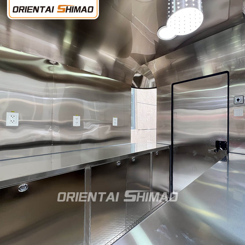 Innenraum aus Edelstahl: Der Innenraum ist aus Edelstahl gefertigt, was einen stabilen und langlebigen Innenraum gewährleistet, der leicht zu reinigen und zu pflegen ist und den Lebensmittelhygienestandards entspricht. Der Einsatz von Edelstahl verbessert nicht nur die Lebensdauer des Foodtrucks, sondern gewährleistet auch die Hygiene und Sicherheit bei der Lebensmittelzubereitung.