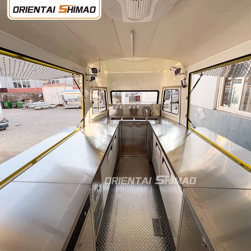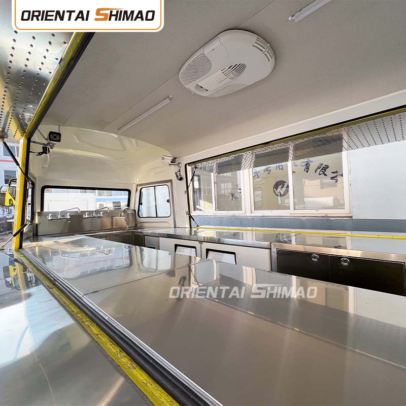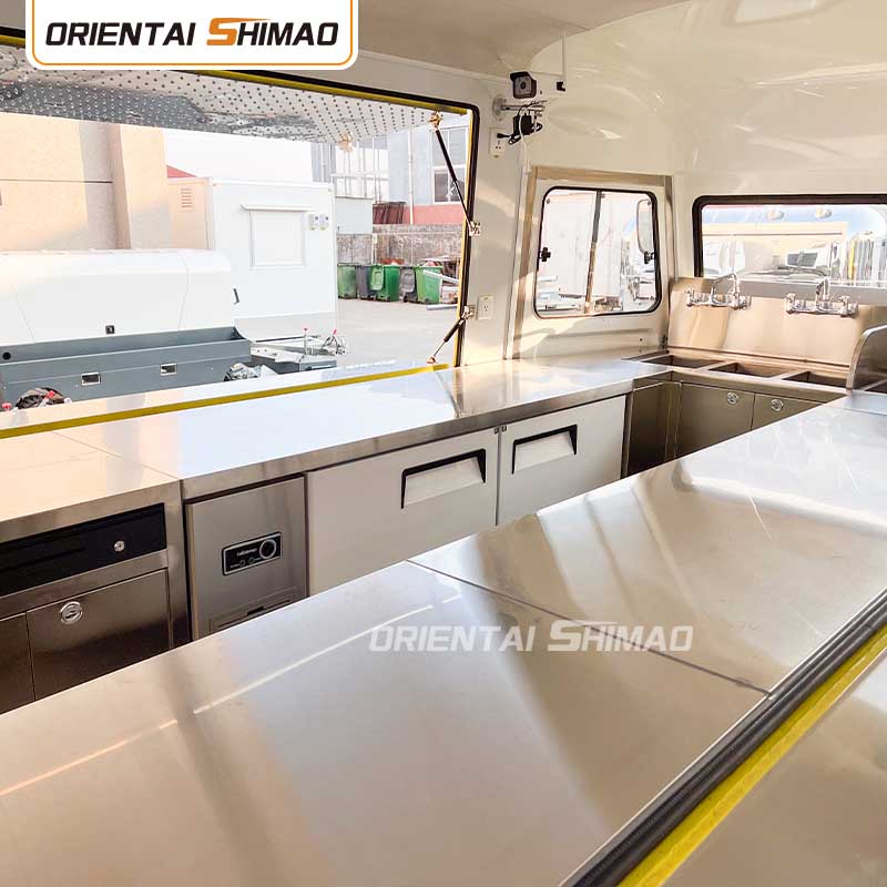 Vielseitigkeit: Um den Anforderungen verschiedener Catering-Szenarien gerecht zu werden, ist in das Fahrzeug eine Vielzahl professioneller Koch- und Aufbewahrungsgeräte eingebaut, die von Kochutensilien bis hin zu Stauraum für Zutaten reichen und den Anforderungen vielfältiger und hocheffizienter Catering-Betriebe gerecht werden und die Betriebseffizienz erheblich steigern, sei es beim Kochen vor Ort oder bei der Lieferung von Fastfood.
