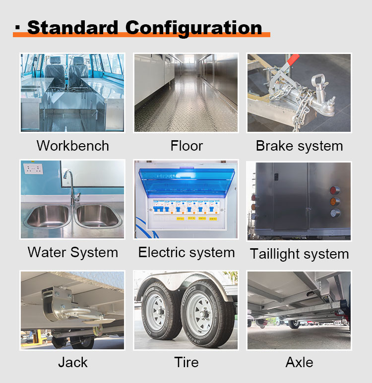Als Hauptmaterial haben wir uns für hochwertigen Edelstahl 304 entschieden, der für seine hervorragende Korrosionsbeständigkeit und hervorragende Haltbarkeit bekannt ist und unter verschiedenen Umgebungsbedingungen eine stabile Leistung aufrechterhalten kann. So stellen wir sicher, dass unsere Food Catering Trailers-Produkte auch langfristig ihre hervorragende Qualität und Funktionalität beibehalten und einer Vielzahl von Herausforderungen standhalten können. Die hervorragende Korrosionsbeständigkeit des Edelstahls 304 sorgt dafür, dass der LKW nicht leicht durch Oxidation oder Rost beeinträchtigt wird, was seine Lebensdauer erheblich verlängert. Die hervorragende Korrosionsbeständigkeit von Edelstahl 304 macht den LKW weniger anfällig für Oxidation oder Rost, was seine Lebensdauer erheblich verlängert.