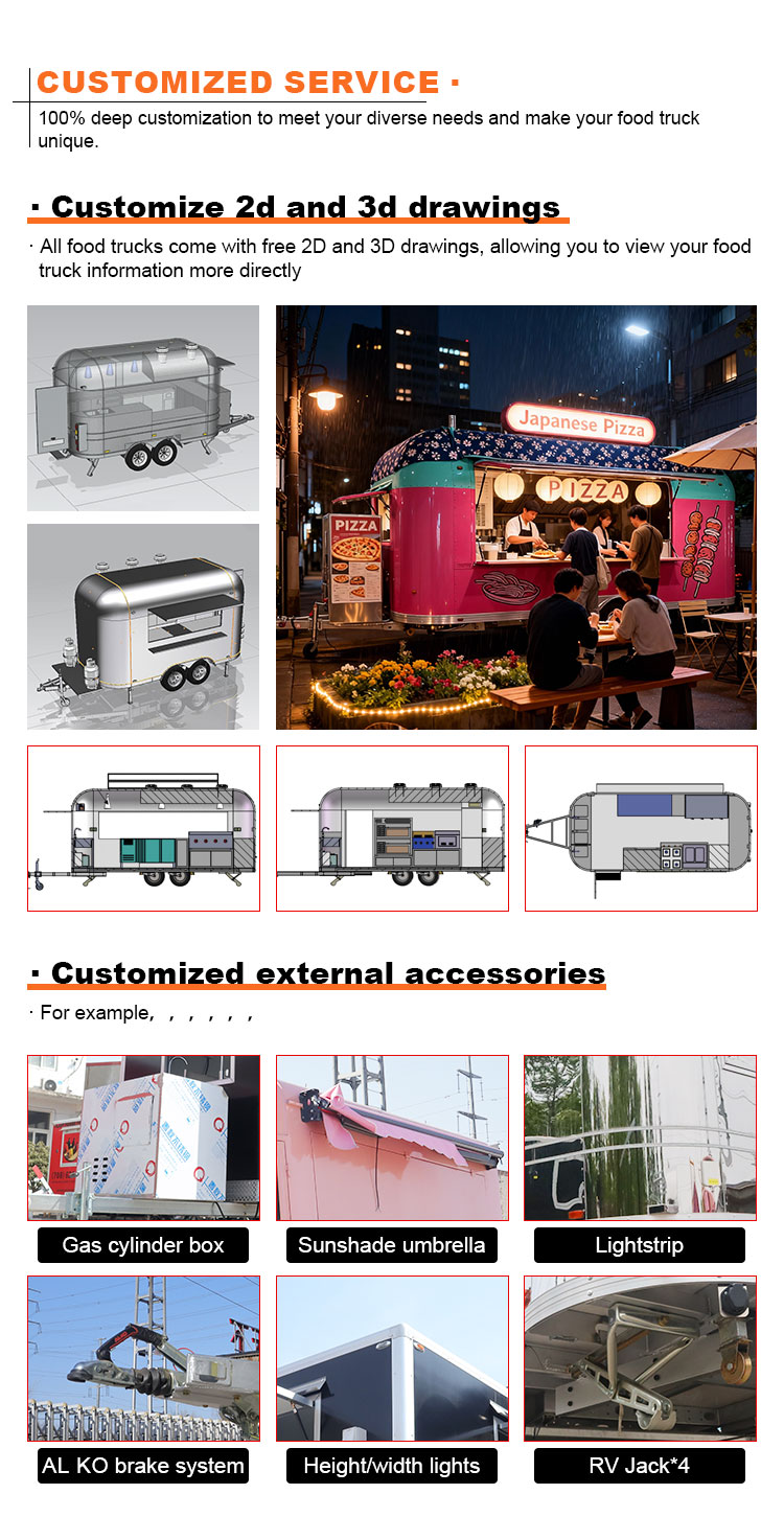 Als Hauptmaterial haben wir uns für hochwertigen Edelstahl 304 entschieden, der für seine hervorragende Korrosionsbeständigkeit und hervorragende Haltbarkeit bekannt ist und unter verschiedenen Umgebungsbedingungen eine stabile Leistung aufrechterhalten kann. So stellen wir sicher, dass unsere Food Catering Trailers-Produkte auch langfristig ihre hervorragende Qualität und Funktionalität beibehalten und einer Vielzahl von Herausforderungen standhalten können. Die hervorragende Korrosionsbeständigkeit des Edelstahls 304 sorgt dafür, dass der LKW nicht leicht durch Oxidation oder Rost beeinträchtigt wird, was seine Lebensdauer erheblich verlängert. Die hervorragende Korrosionsbeständigkeit von Edelstahl 304 macht den LKW weniger anfällig für Oxidation oder Rost, was seine Lebensdauer erheblich verlängert.