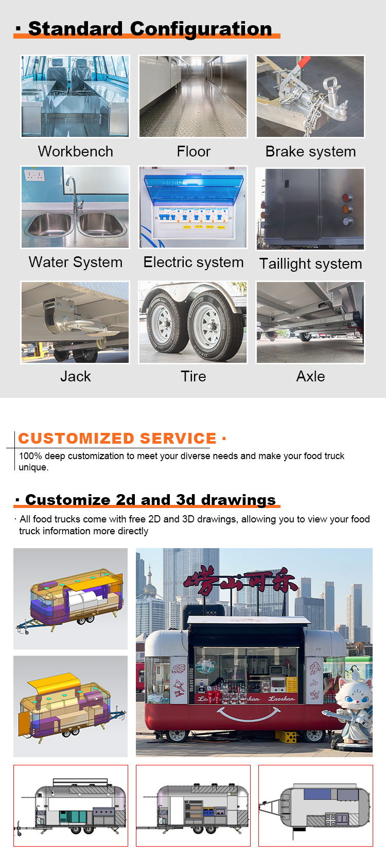 Als Hauptmaterial haben wir uns für hochwertigen Edelstahl 304 entschieden, der für seine hervorragende Korrosionsbeständigkeit und hervorragende Haltbarkeit bekannt ist und unter verschiedenen Umgebungsbedingungen eine stabile Leistung aufrechterhalten kann. So stellen wir sicher, dass unsere Food Catering Trailers-Produkte auch langfristig ihre hervorragende Qualität und Funktionalität beibehalten und einer Vielzahl von Herausforderungen standhalten können. Die hervorragende Korrosionsbeständigkeit des Edelstahls 304 sorgt dafür, dass der LKW nicht leicht durch Oxidation oder Rost beeinträchtigt wird, was seine Lebensdauer erheblich verlängert. Die hervorragende Korrosionsbeständigkeit von Edelstahl 304 macht den LKW weniger anfällig für Oxidation oder Rost, was seine Lebensdauer erheblich verlängert.