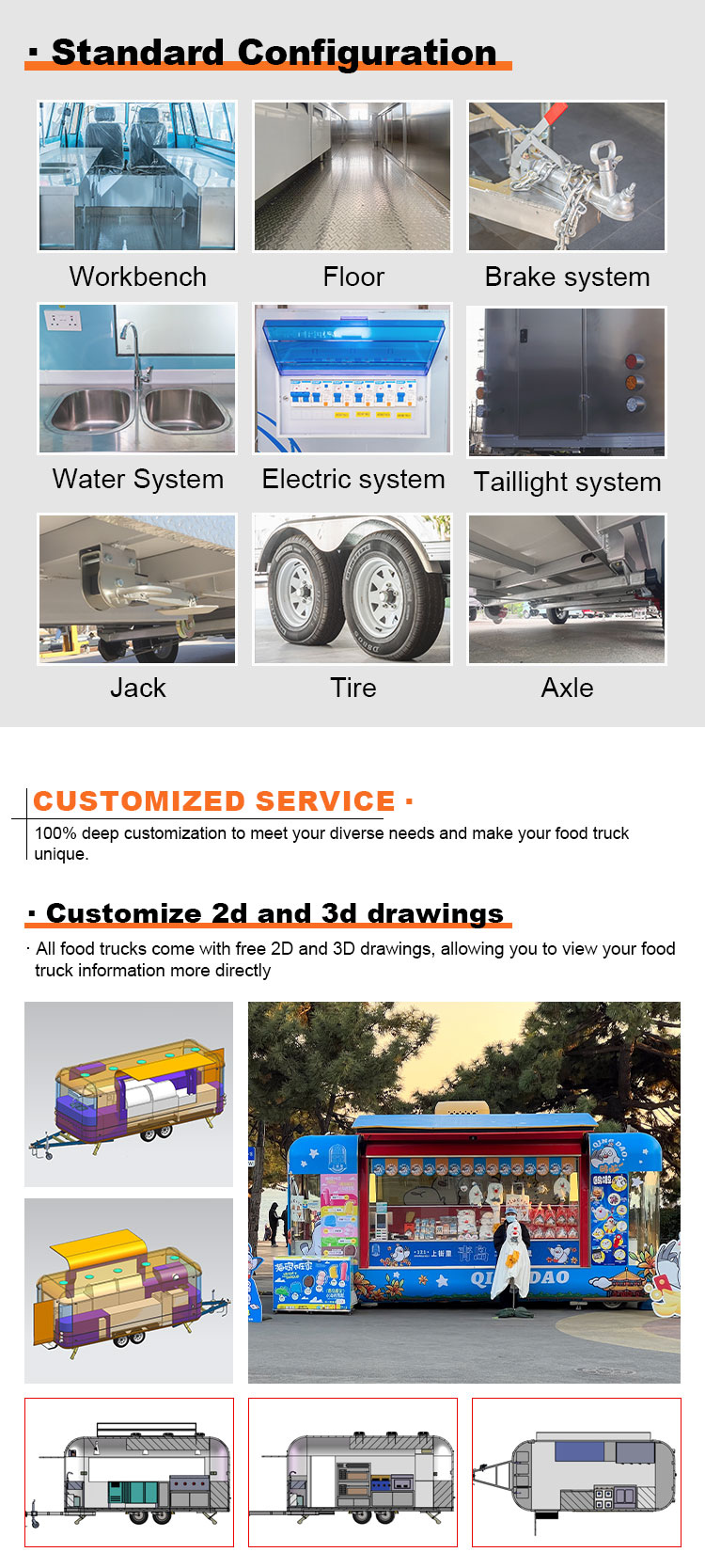 Als Hauptmaterial haben wir uns für hochwertigen Edelstahl 304 entschieden, der für seine hervorragende Korrosionsbeständigkeit und hervorragende Haltbarkeit bekannt ist und unter verschiedenen Umgebungsbedingungen eine stabile Leistung aufrechterhalten kann. So stellen wir sicher, dass unsere Food Catering Trailers-Produkte auch langfristig ihre hervorragende Qualität und Funktionalität beibehalten und einer Vielzahl von Herausforderungen standhalten können. Die hervorragende Korrosionsbeständigkeit des Edelstahls 304 sorgt dafür, dass der LKW nicht leicht durch Oxidation oder Rost beeinträchtigt wird, was seine Lebensdauer erheblich verlängert. Die hervorragende Korrosionsbeständigkeit von Edelstahl 304 macht den LKW weniger anfällig für Oxidation oder Rost, was seine Lebensdauer erheblich verlängert.