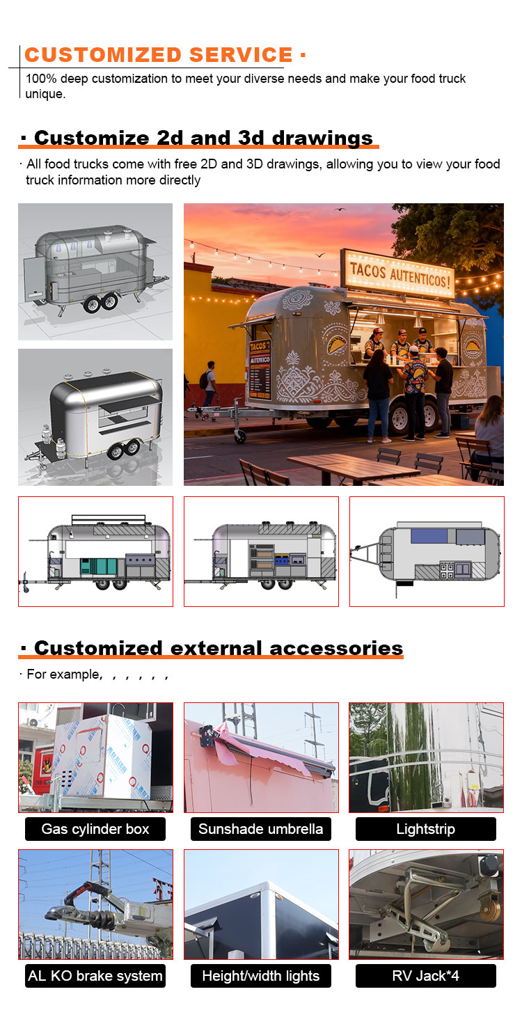 Als Hauptmaterial haben wir uns für hochwertigen Edelstahl 304 entschieden, der für seine hervorragende Korrosionsbeständigkeit und hervorragende Haltbarkeit bekannt ist und unter verschiedenen Umgebungsbedingungen eine stabile Leistung aufrechterhalten kann. So stellen wir sicher, dass unsere Food Catering Trailers-Produkte auch langfristig ihre hervorragende Qualität und Funktionalität beibehalten und einer Vielzahl von Herausforderungen standhalten können. Die hervorragende Korrosionsbeständigkeit des Edelstahls 304 sorgt dafür, dass der LKW nicht leicht durch Oxidation oder Rost beeinträchtigt wird, was seine Lebensdauer erheblich verlängert. Die hervorragende Korrosionsbeständigkeit von Edelstahl 304 macht den LKW weniger anfällig für Oxidation oder Rost, was seine Lebensdauer erheblich verlängert.