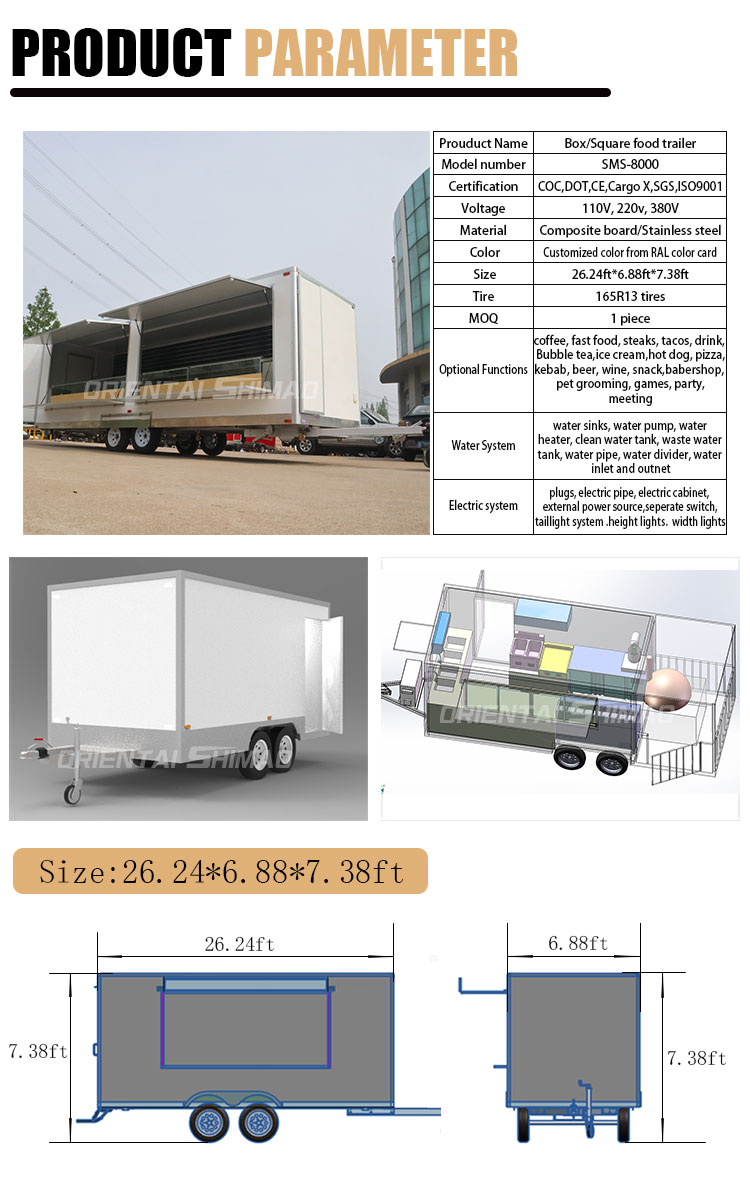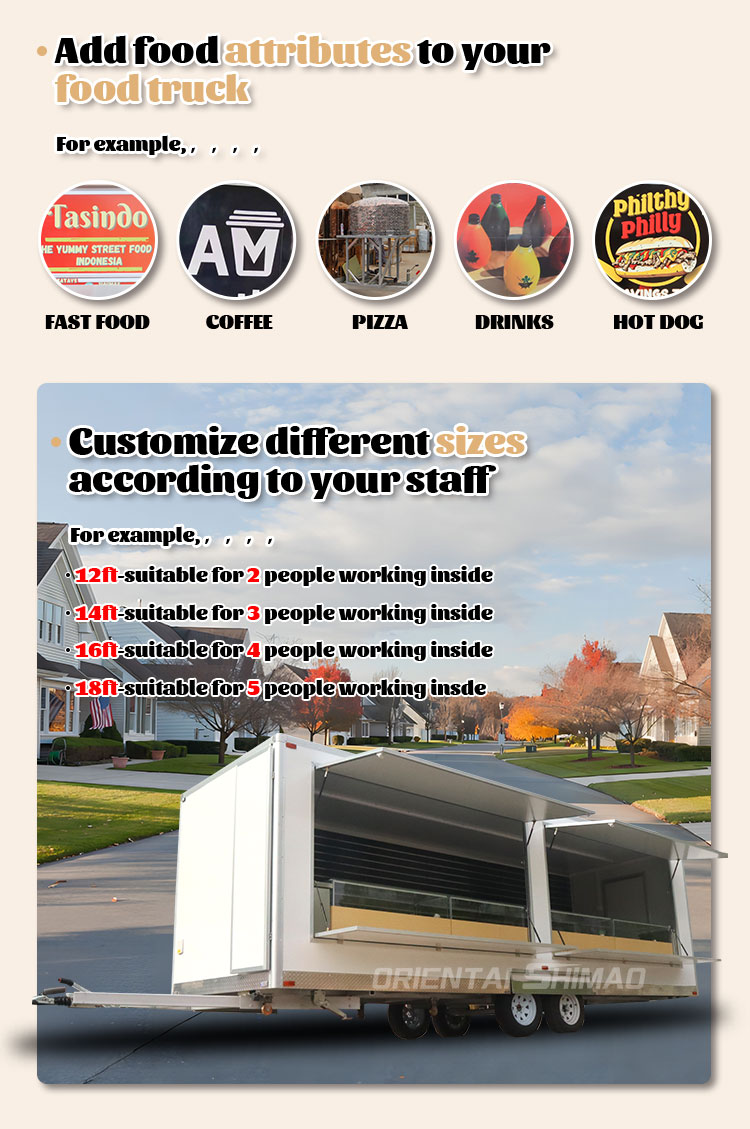 Noch wichtiger ist, dass der flexible und vielseitige Geschäftsansatz von Oriental Shimao Food Trailer aus Edelstahl genau an das sich schnell verändernde Tempo des modernen Lebens angepasst ist. Egal, ob es sich um den Eile des Mittagessens im Geschäftsviertel oder die Freizeit am Abend handelt, es kann seine Strategie schnell anpassen, die Catering -Bedürfnisse verschiedener Menschen zu unterschiedlichen Zeiten zu erfüllen. Diese beispiellose Anpassungsfähigkeit lässt den orientalischen Shimao -Lebensmittelanhänger aus rostfreiem Stahl nicht nur auf dem stark wettbewerbsfähigen Catering -Markt hervorheben, sondern macht sie auch zu einer wichtigen Kraft, die Innovationen und Setzen von Trends in der Branche vorantreibt.