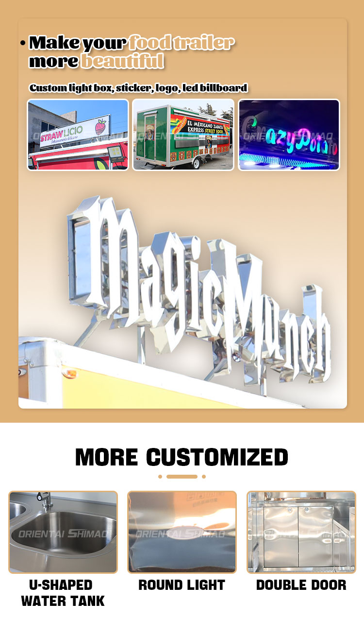 Bei Oriental Shimao Food Trailer Edelstahl verstehen wir die einzigartigen Bedürfnisse und personalisierten Aktivitäten aller unserer Kunden. Daher sind wir bestrebt, ein umfassendes Angebot an detaillierten Anpassungsdiensten anzubieten, um sicherzustellen, dass jeder Lebensmittelwagen perfekt zu Ihrer Geschäftsphilosophie und Ihrem Markenbild passt. Das Folgende ist eine detaillierte Erweiterung unserer wichtigsten Produktanpassungsdienste: