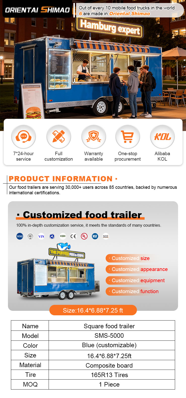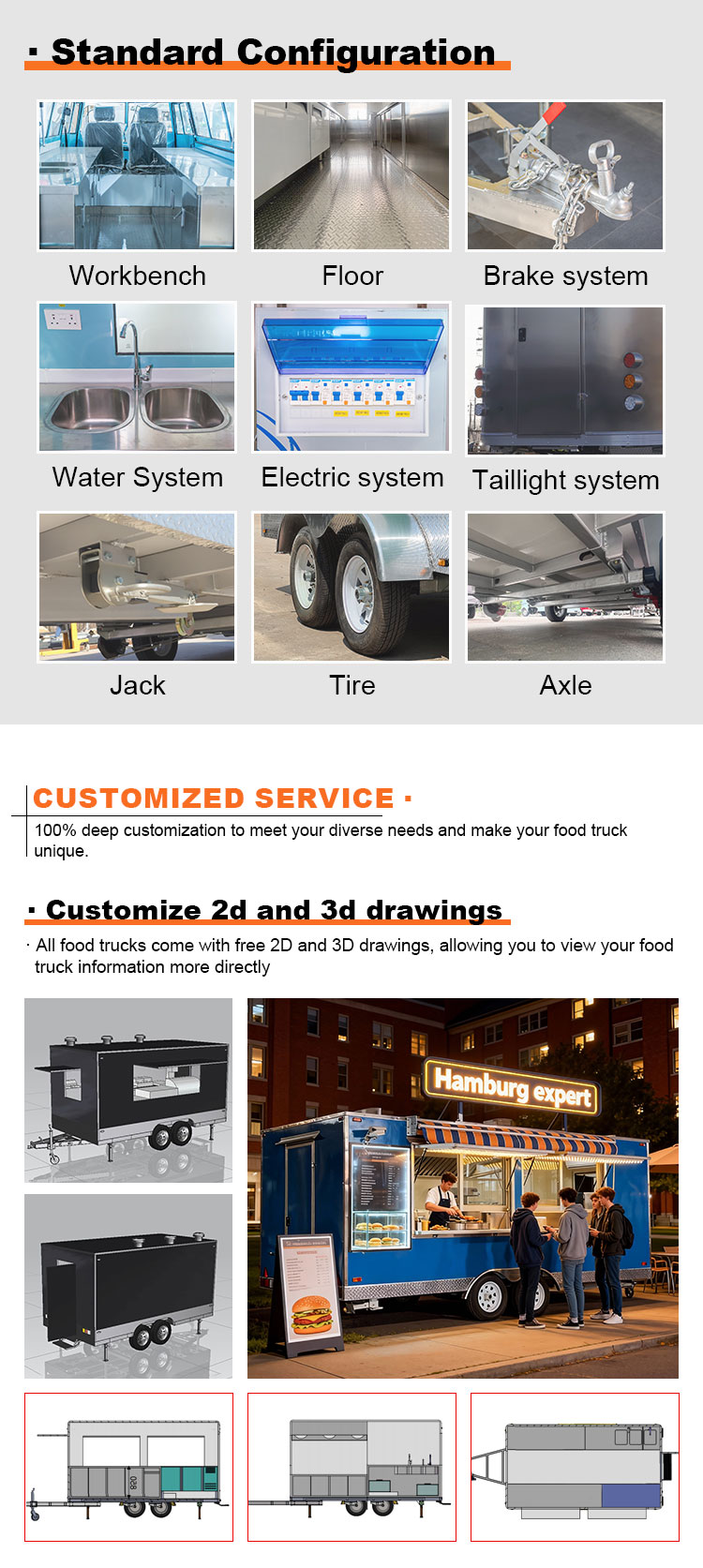 Zusätzliche Funktionen: Fügen Sie je nach Kundenwunsch weitere Zusatzfunktionen hinzu, z. B. Kühlung und Frischhaltung, Heizung und Wärmekonservierung, Wasserdichtigkeit und Anti-Elektrizität usw., um die Praktikabilität und Sicherheit des Imbisswagens zu verbessern.