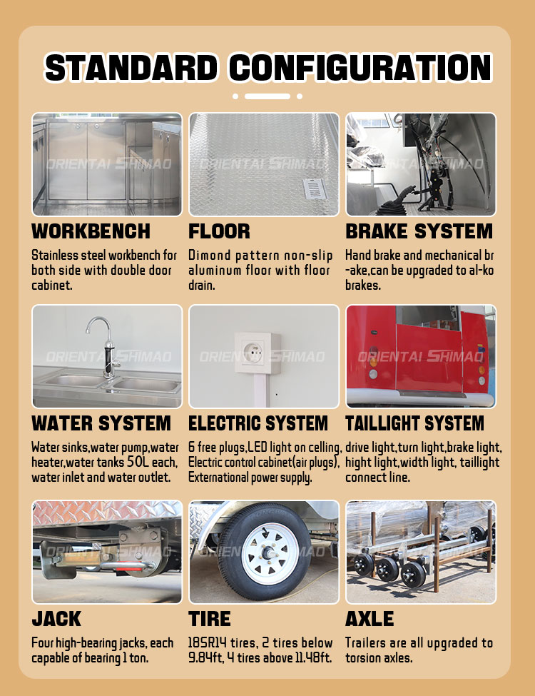 Die allgemeinen Abmessungen des Straßenanhängers der Straße sind 16,4 Fuß lang, 6,88 Fuß breit und 7,38 Fuß hoch, mit viel Platz im Fahrzeug, die für die Installation einer Vielzahl von Kochgeräten und Serviereinrichtungen geeignet sind, um eine effiziente Vorbereitung und das Servieren der Speisen zu gewährleisten.