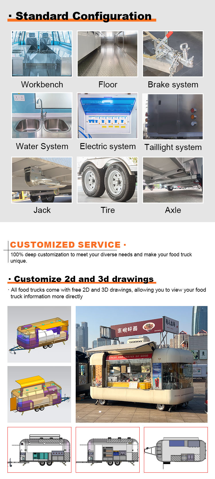 Als Hauptmaterial haben wir uns für hochwertigen Edelstahl 304 entschieden, der für seine hervorragende Korrosionsbeständigkeit und hervorragende Haltbarkeit bekannt ist und unter verschiedenen Umgebungsbedingungen eine stabile Leistung aufrechterhalten kann. So stellen wir sicher, dass unsere Food Catering Trailers-Produkte auch langfristig ihre hervorragende Qualität und Funktionalität beibehalten und einer Vielzahl von Herausforderungen standhalten können. Die hervorragende Korrosionsbeständigkeit des Edelstahls 304 sorgt dafür, dass der LKW nicht leicht durch Oxidation oder Rost beeinträchtigt wird, was seine Lebensdauer erheblich verlängert. Die hervorragende Korrosionsbeständigkeit von Edelstahl 304 macht den LKW weniger anfällig für Oxidation oder Rost, was seine Lebensdauer erheblich verlängert.