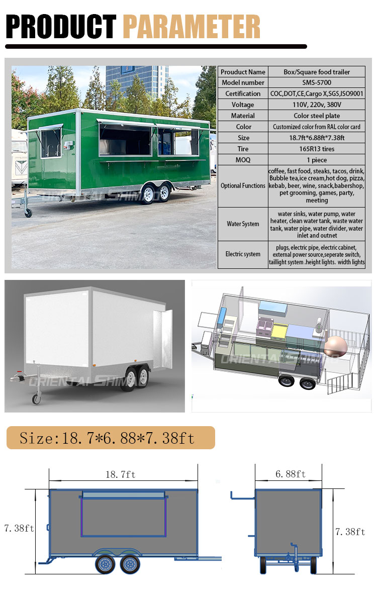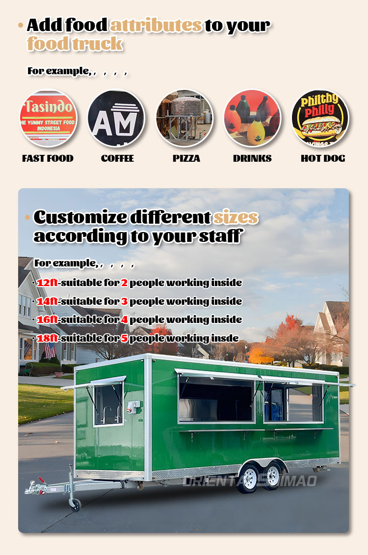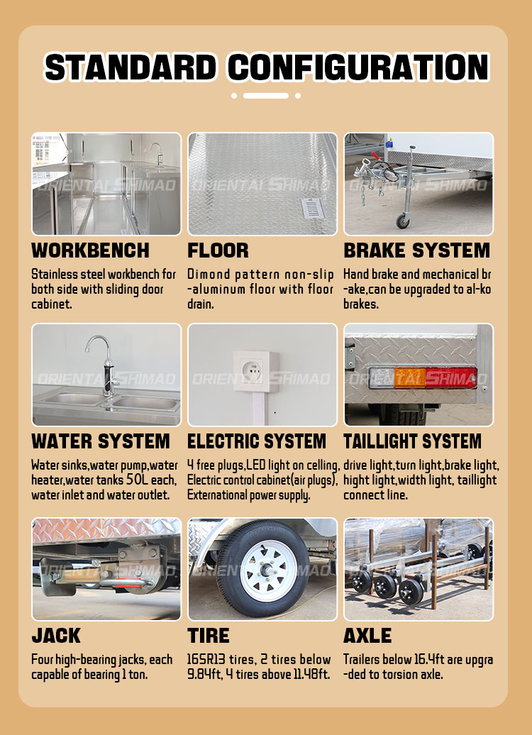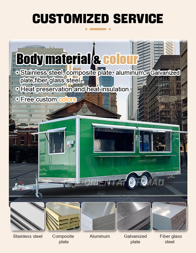 Zusätzliche Funktionen: Fügen Sie je nach Kundenwunsch weitere Zusatzfunktionen hinzu, z. B. Kühlung und Frischhaltung, Heizung und Wärmekonservierung, Wasserdichtigkeit und Anti-Elektrizität usw., um die Praktikabilität und Sicherheit des Imbisswagens zu verbessern.