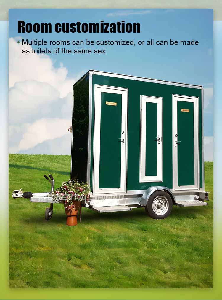 · Leistungsstarke mobile Leistung: Dieses mobile Toilettenhaus ist mit Hochleistungsreifen und einem verstärkten Aufhängungssystem ausgestattet, um sicherzustellen, dass es problemlos mit allen Arten von Geländs umgehen kann und bewegt und stabil und sicher eingesetzt wird, sei es an einer schlammigen Baustelle oder einem robusten Außenstandort.
