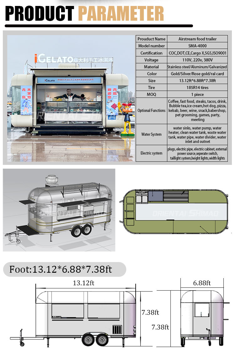 Goldener Edelstahl: Das Äußere des Imbisswagens besteht aus hochwertigem goldenem Edelstahl. Dieses Material verfügt nicht nur über eine hervorragende Korrosions- und Abriebfestigkeit, sondern das goldene Aussehen erhöht auch die optische Schönheit und das hochwertige Gefühl, sodass der Imbisswagen in verschiedenen Umgebungen hervorstechen kann.