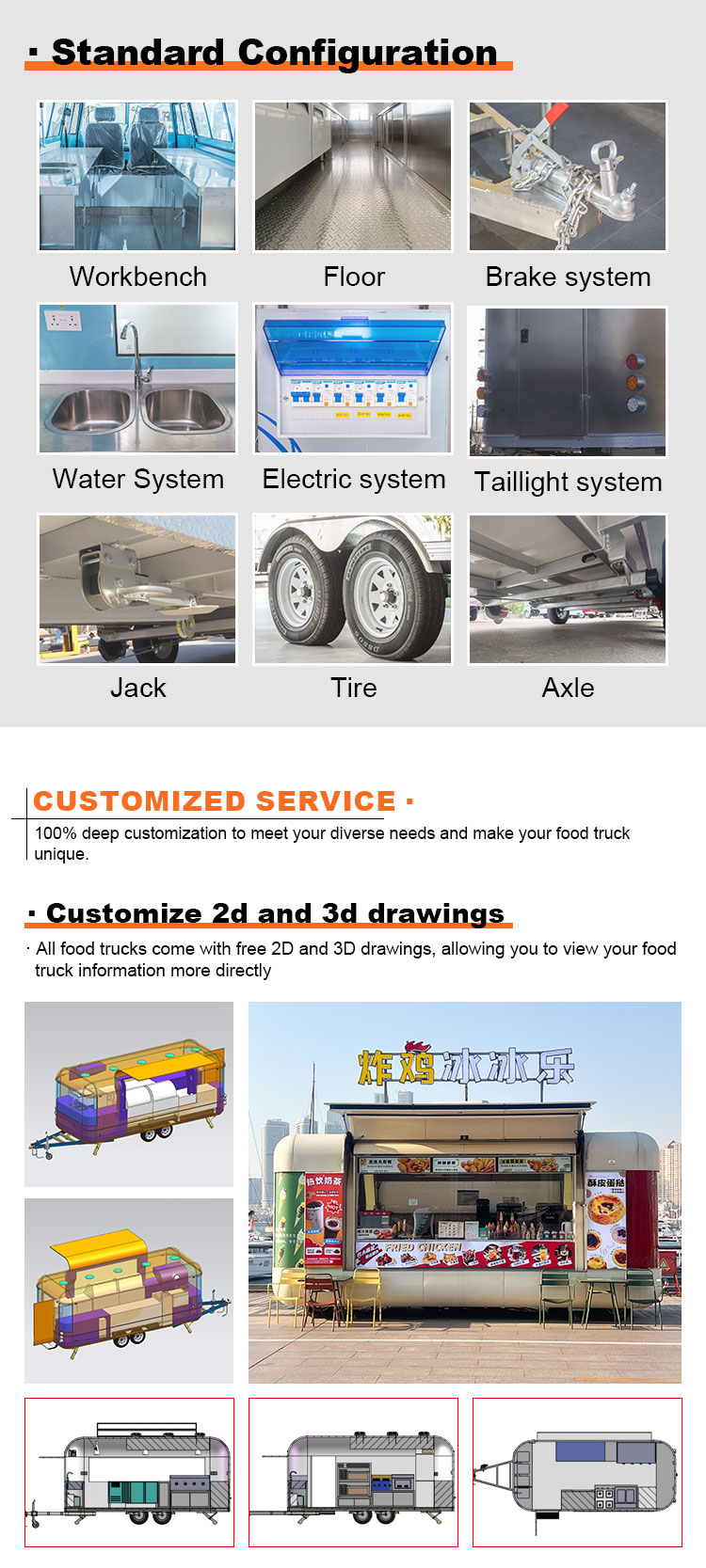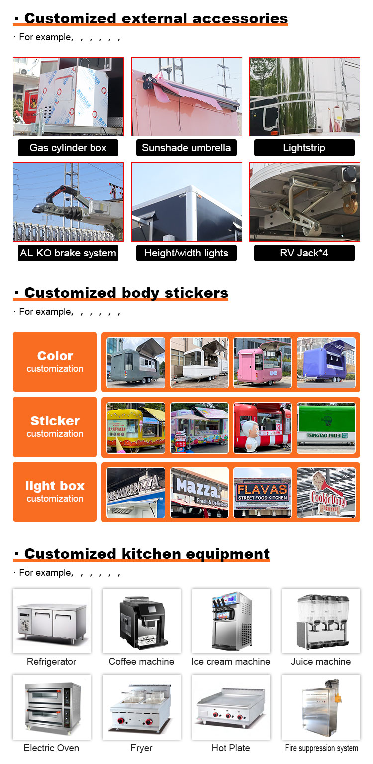 Als Hauptmaterial haben wir uns für hochwertigen Edelstahl 304 entschieden, der für seine hervorragende Korrosionsbeständigkeit und hervorragende Haltbarkeit bekannt ist und unter verschiedenen Umgebungsbedingungen eine stabile Leistung aufrechterhalten kann. Dadurch wird sichergestellt, dass unsere Pizza Trucks-Produkte ihre hervorragende Qualität und Funktionalität auch langfristig beibehalten und einer Vielzahl von Herausforderungen standhalten können. Die hervorragende Korrosionsbeständigkeit des Edelstahls 304 sorgt dafür, dass der LKW nicht leicht durch Oxidation oder Rost beeinträchtigt wird, was seine Lebensdauer erheblich verlängert. Die hervorragende Korrosionsbeständigkeit von Edelstahl 304 macht den LKW weniger anfällig für Oxidation oder Rost, was seine Lebensdauer erheblich verlängert.