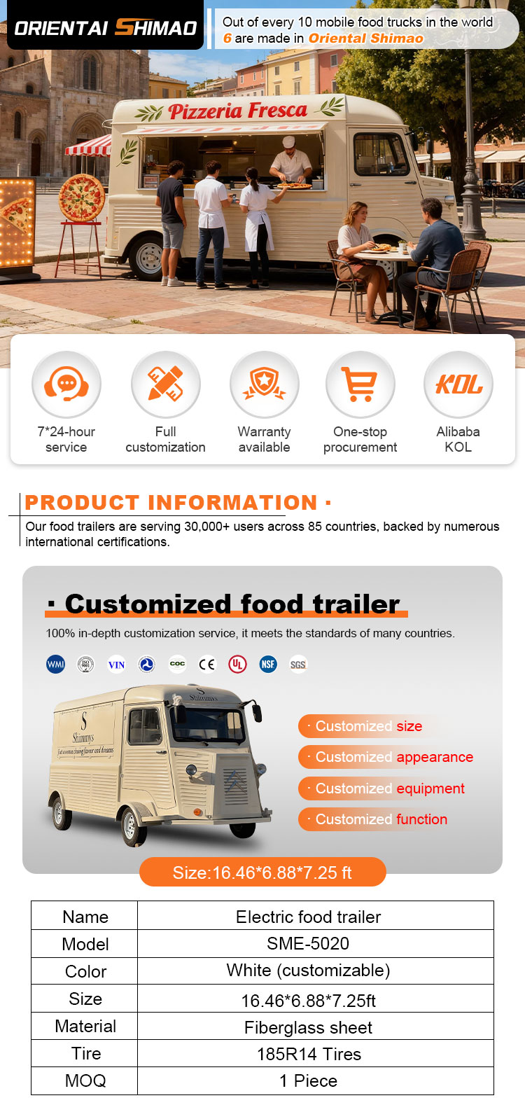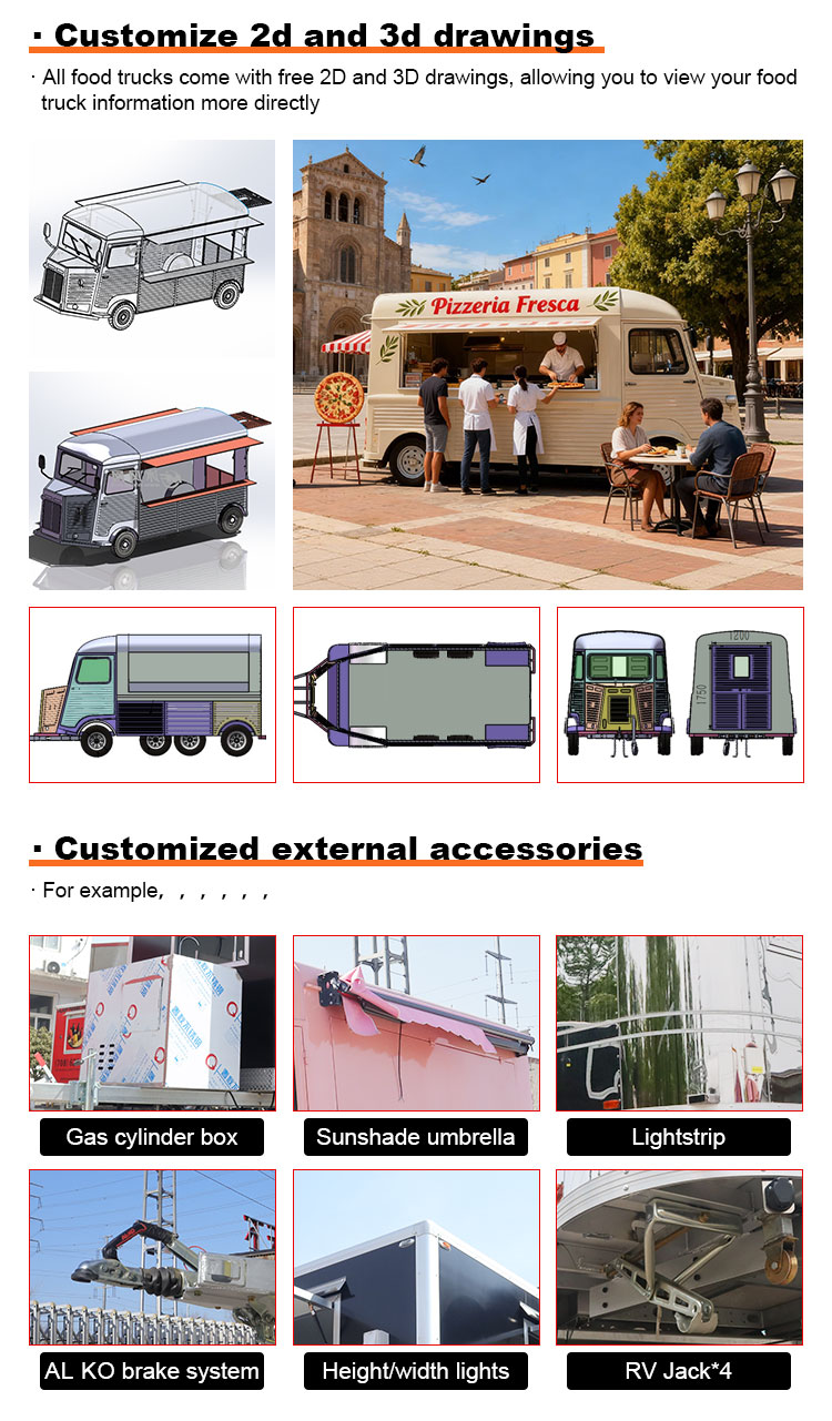 Zusätzliche Funktionen: Fügen Sie je nach Kundenwunsch weitere Zusatzfunktionen hinzu, z. B. Kühlung und Frischhaltung, Heizung und Wärmekonservierung, Wasserdichtigkeit und Anti-Elektrizität usw., um die Praktikabilität und Sicherheit des Imbisswagens zu verbessern.